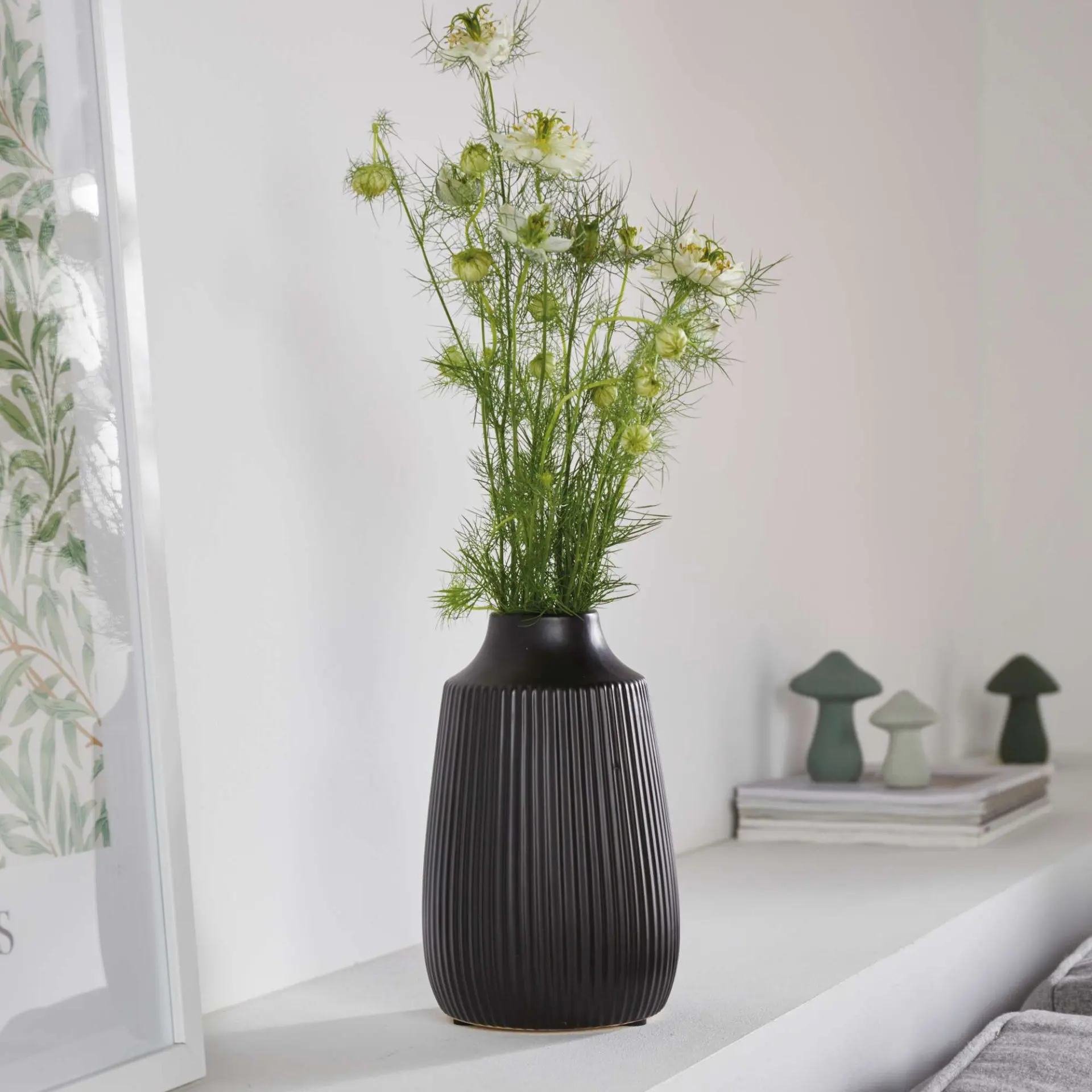 Entdecken Sie die Dekovase "Black" – ein wahres Meisterwerk aus Porzellan! In elegantem mattschwarz gehalten, verleiht sie jedem Raum einen Hauch von Stil und Raffinesse. Die besondere Rillenstruktur sorgt nicht nur für einen visuellen Blickfang, sondern auch für eine angenehme Haptik. Ob als Highlight auf dem Tisch oder als stilvolle Ergänzung im Regal – diese Vase ist vielseitig einsetzbar und zieht alle Blicke auf sich.Porzellan, mattschwarz, Rillenstruktur