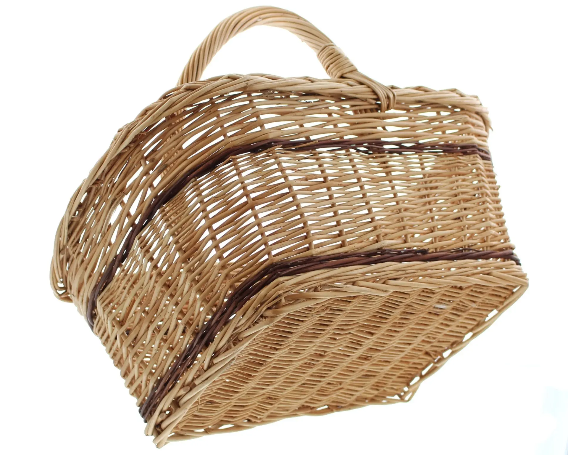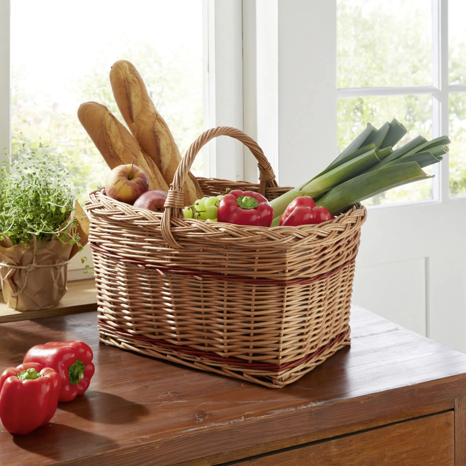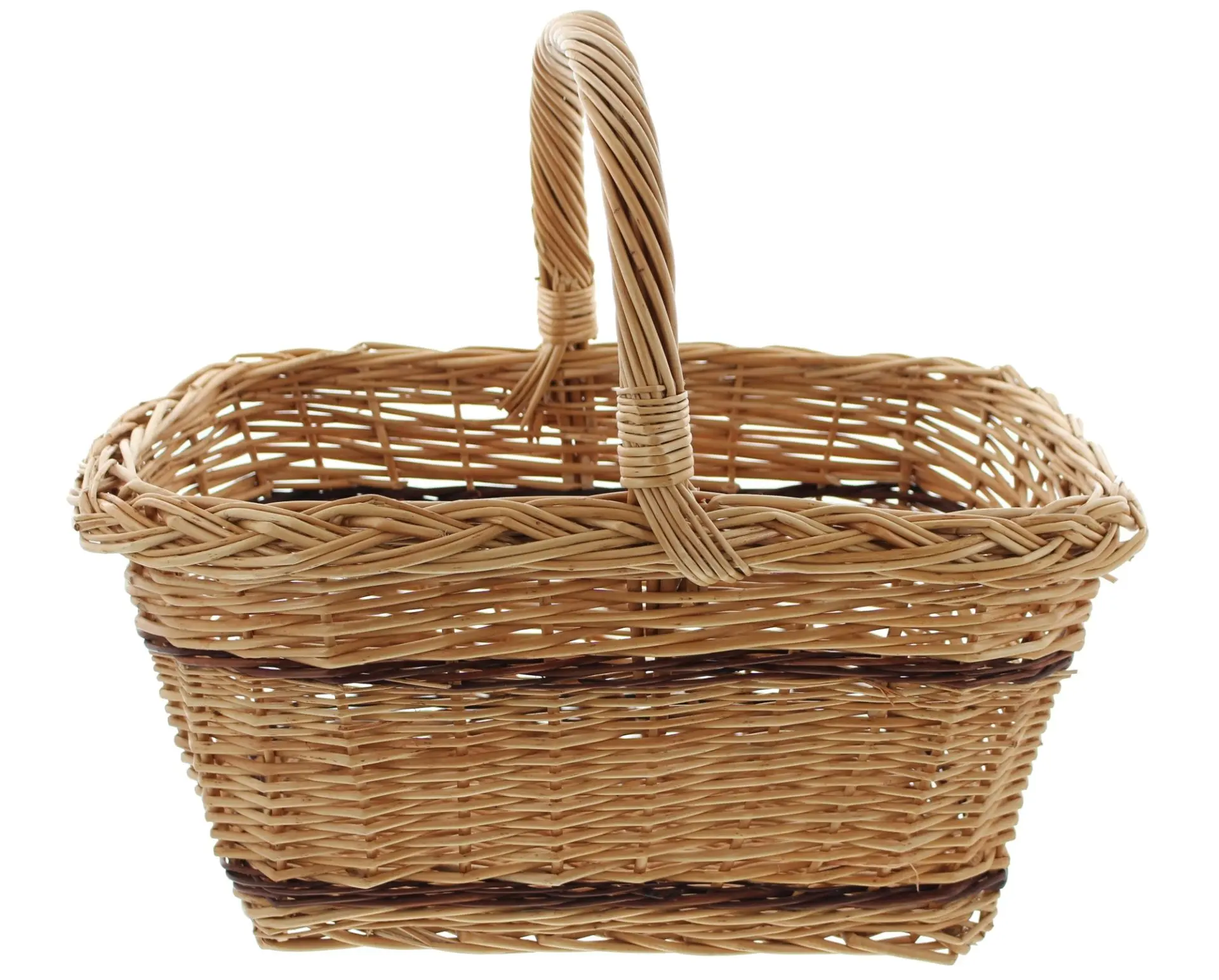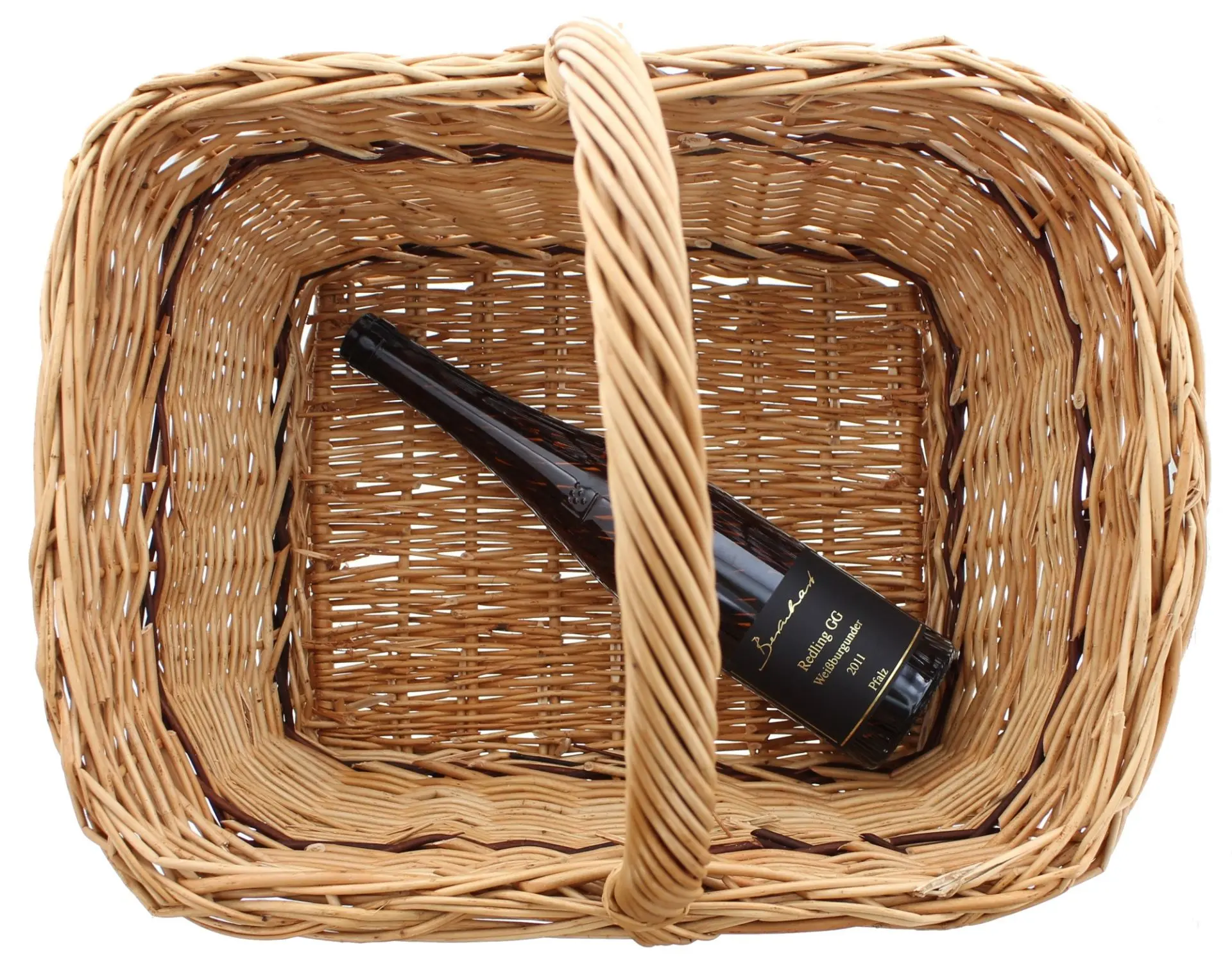 Vollweide, farblich leicht abgesetzte Dekorstreifen, Zopfmusterrand, handgeflochten in Europa.Maße: 49 x 38 x 25 cm, GH 37 cm