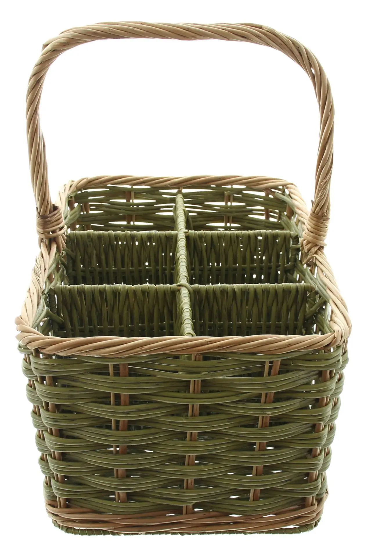 Polyrattan in trendigem Oliveton, Griff und Rand aus ungeschälter Naturweide, stabil auf Metallrahmen geflochten, Facheinteilung