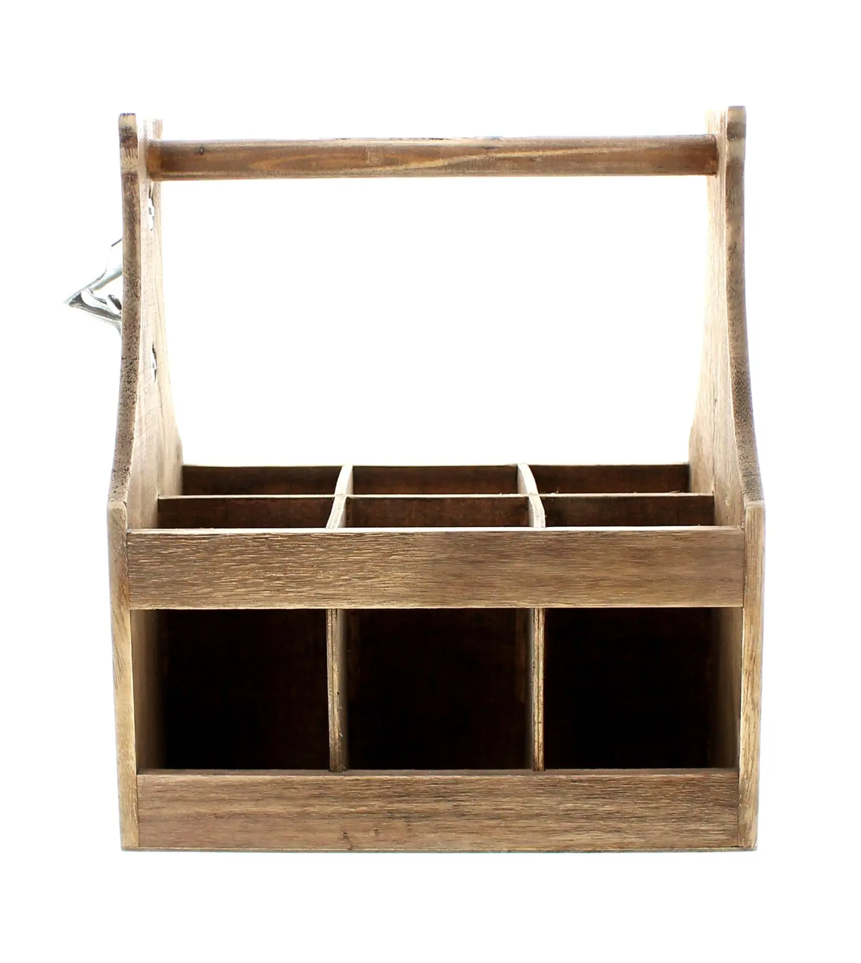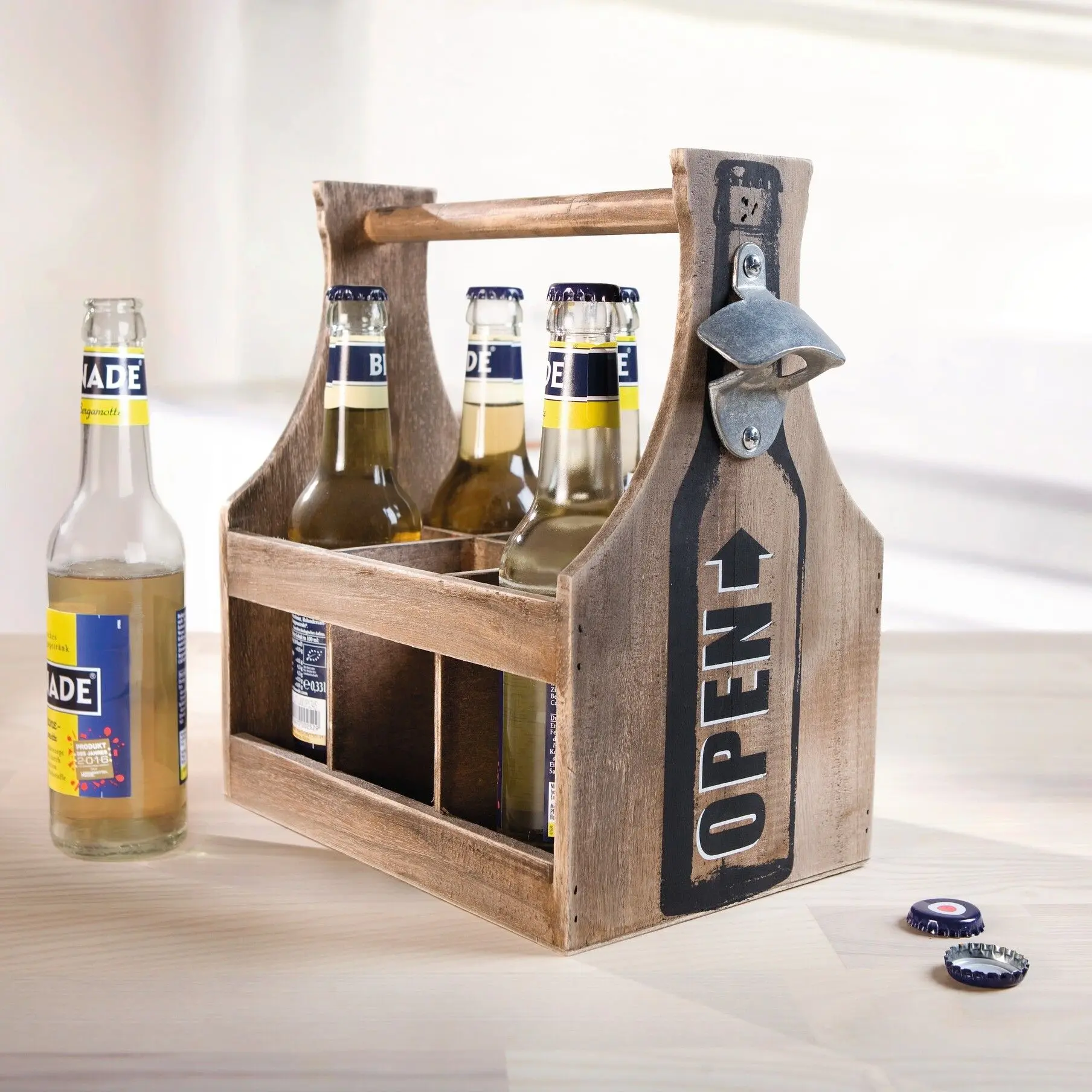 in angesagtem Shabby-Look, braun eingefärbtes Holz mit trendigem Aufdruck in Schwarz/Weiß, praktischer Kronkorkenöffner aus Metall und Facheinteilung für ein Sixpack, geeignet für gängige Flaschen mit 0,33 l Fassungsvermögen