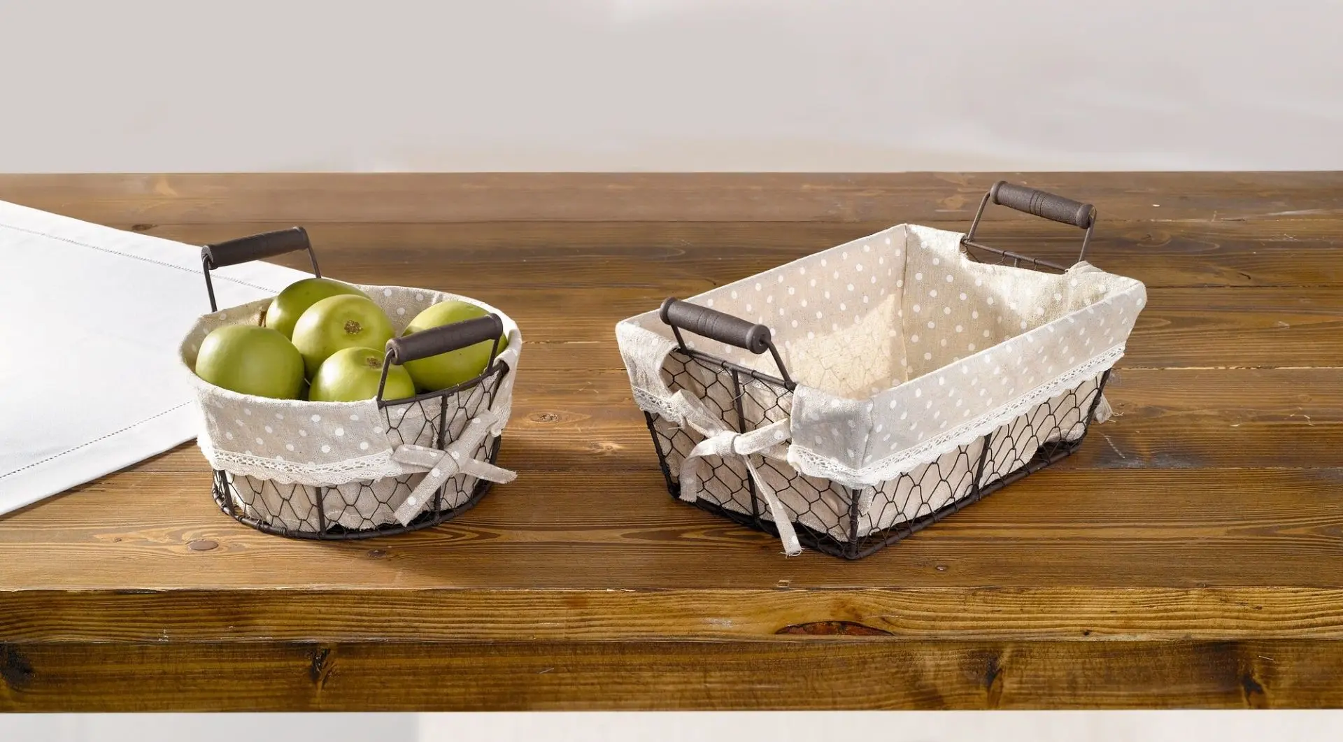herausnehmbarer Stoffeinsatz mit modischem Pünktchenprint und aufwändiger Häkelborte, Metallrahmen mit Drahtgeflecht, seitliche Holzgriffe