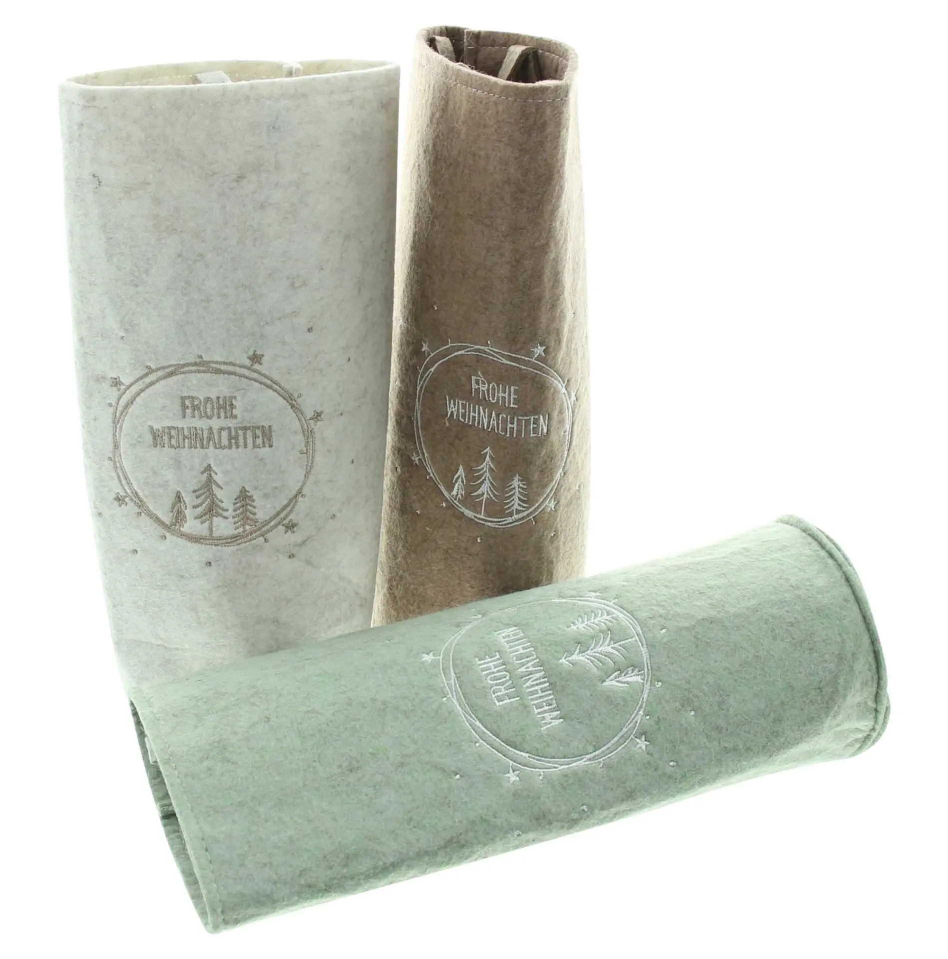 Die Geschenktasche "Frohe Weihnachten", 3er Set, ist die perfekte Wahl für stilvolle Weihnachtsgeschenke. Die hochwertige Verpackung aus Filz in drei verschiedenen Farben ist mit einem festlichen Weihnachtsschriftzug bestickt. Machen Sie Ihren Liebsten eine Freude und verschenken Sie diese einzigartigen Geschenktaschen!