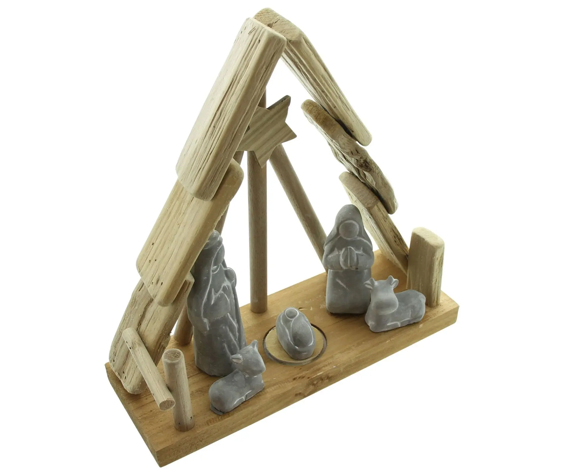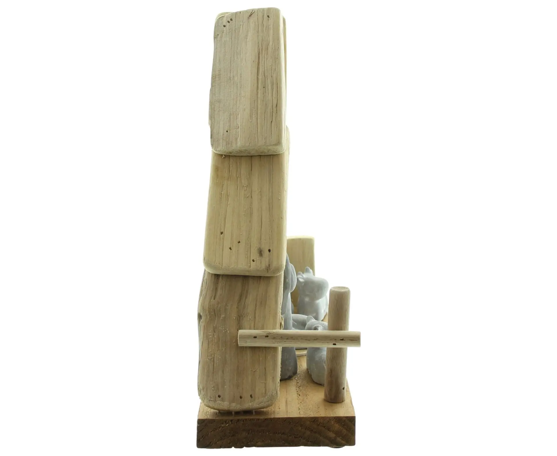 moderne Weihnachtsdeko, Stall aus Buchenholz, weiß gekalkte Betonfiguren, warmweiß leuchtender Ring, möbelschonende Kunststoffnoppen, batteriebetrieben Maße: Höhe 30 cm, ohne Batterien, nur für den Innenbereich geeignet