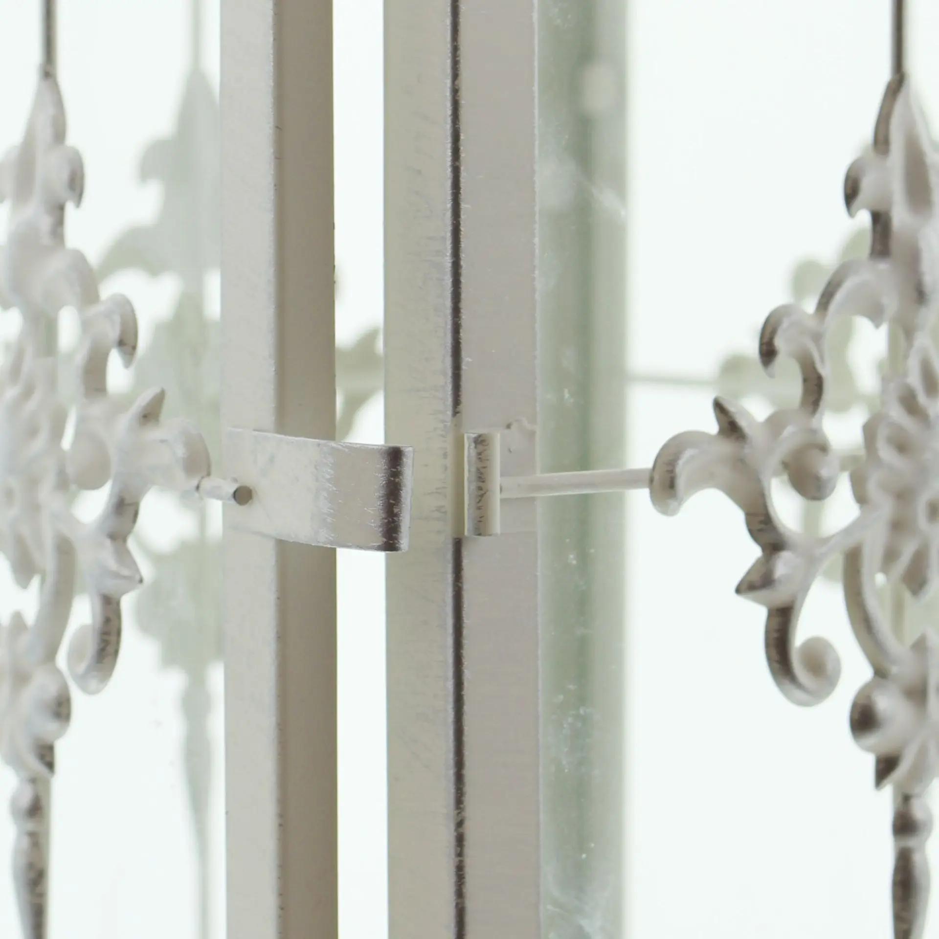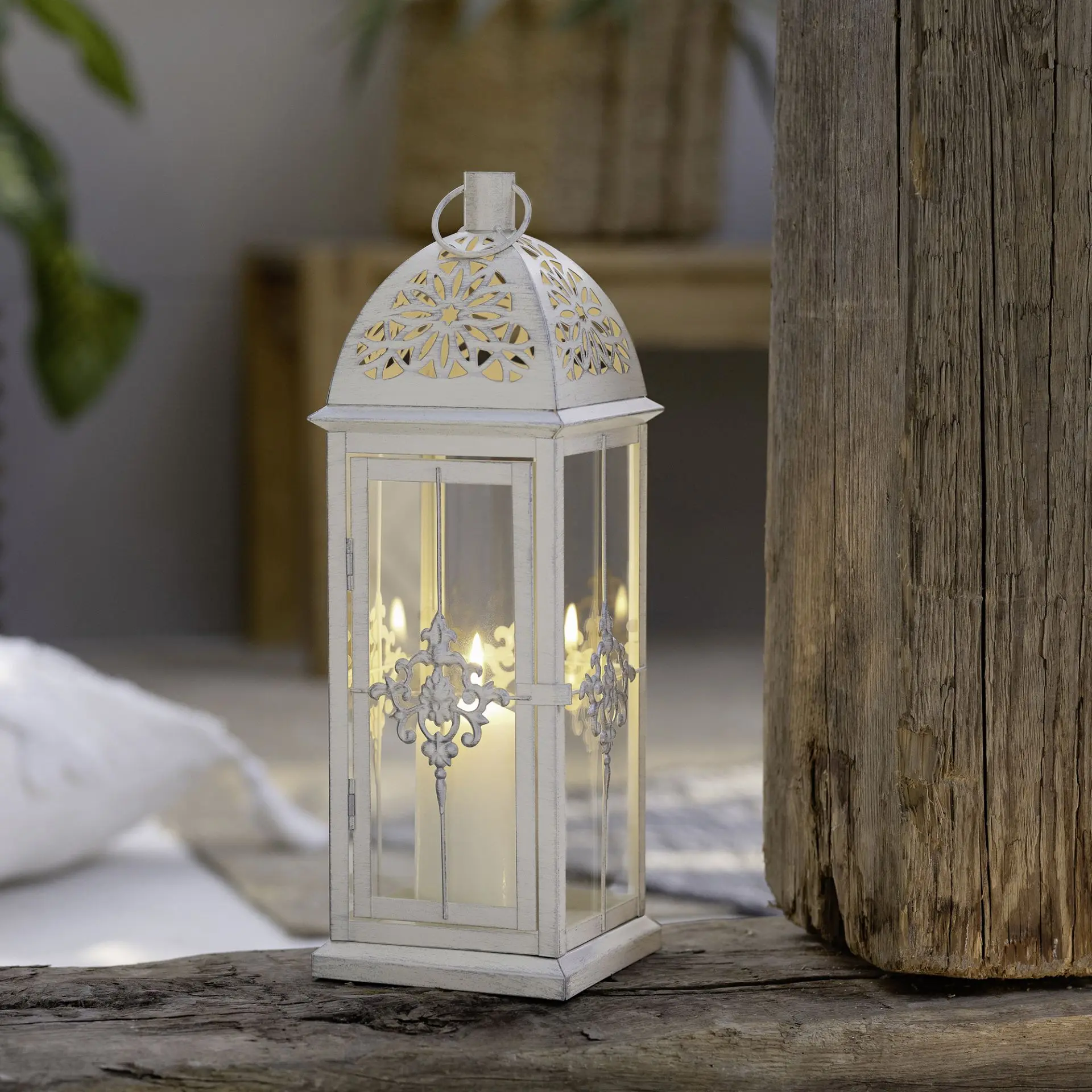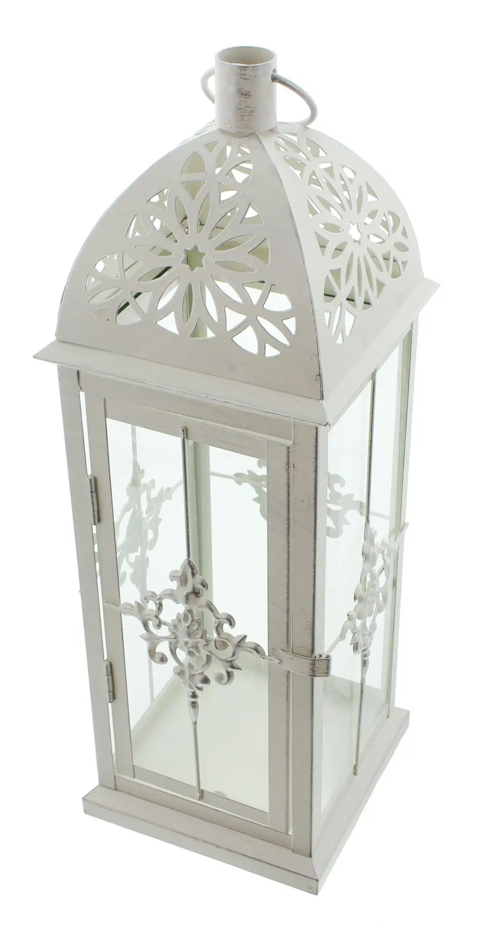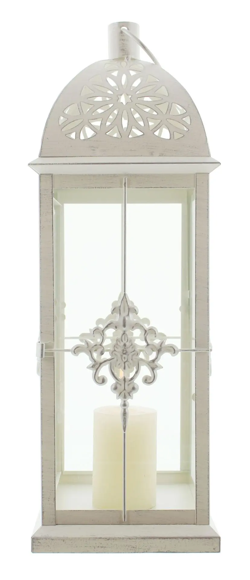 Die Metall-Laterne Barock ist in mattem weiß lackiert. Die dezente Patina in schimmerndem Silber gibt dem Artikel eine historische und schöne Gebraucht-Optik. Die Lochstanzung ist sehr aufwändig gearbeitet. Besonders sticht die elegante Ornamentverzierung hervor. Die Glaseinsätze sind integriert. Eine Kerze ist im Lieferumfang nicht enthalten.