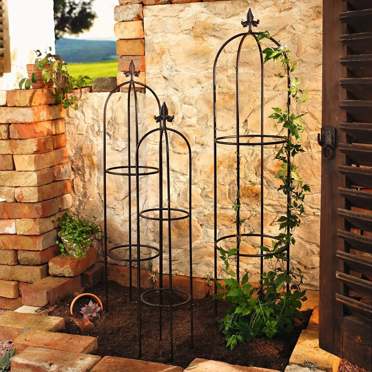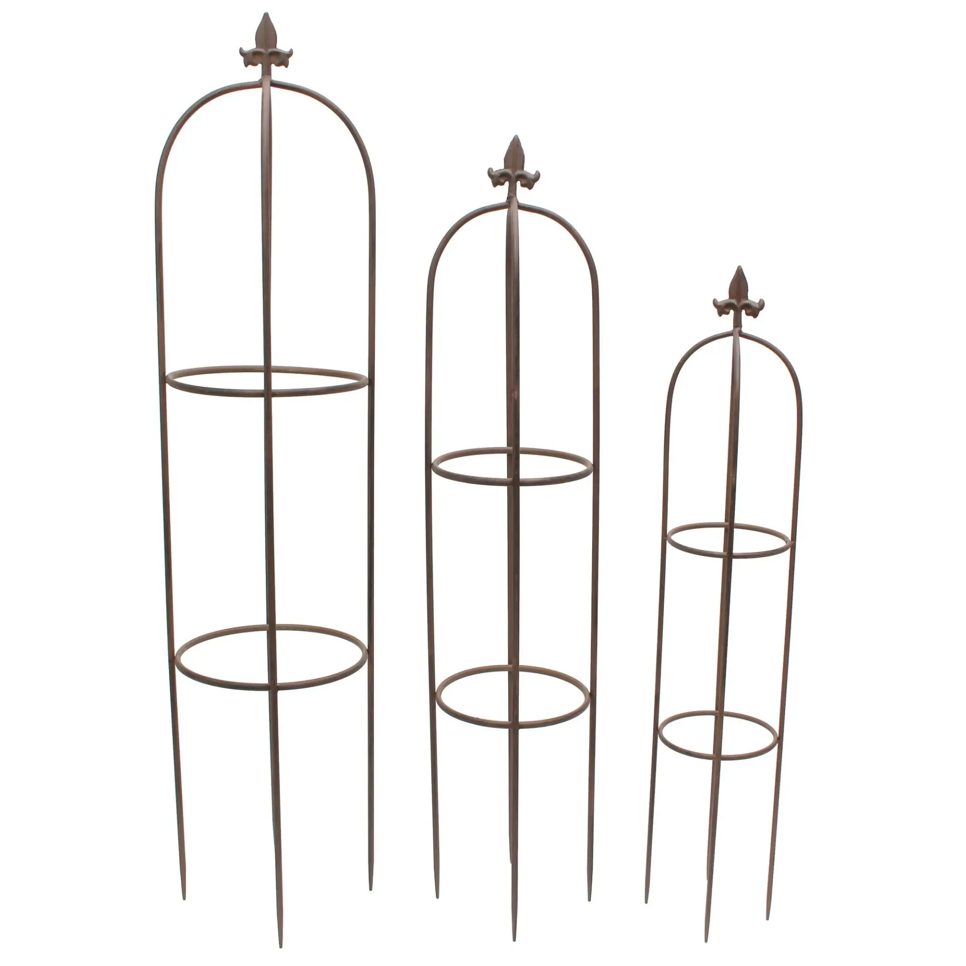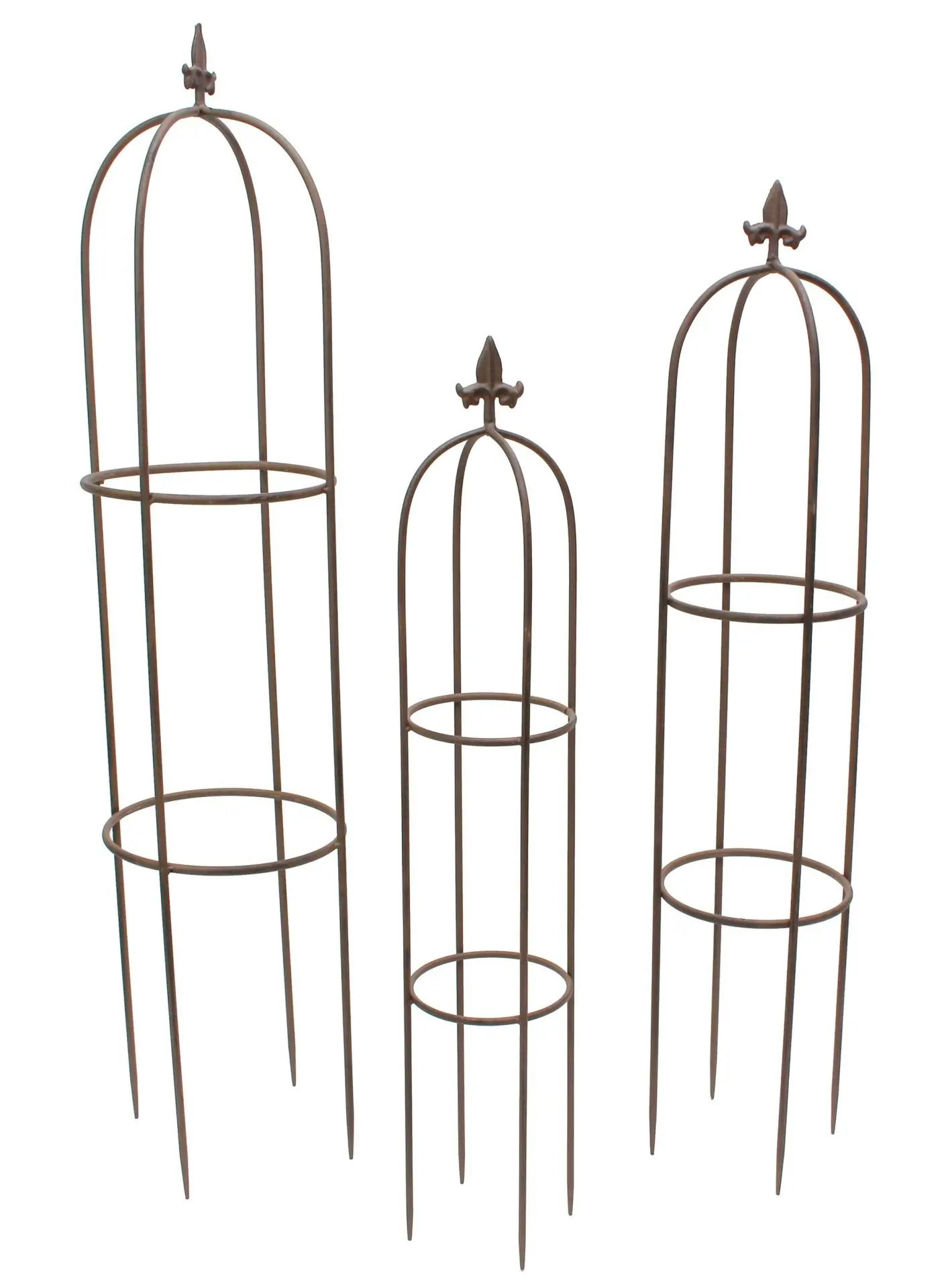 klassische Form, mattschwarz lackiertes Metall, braun/gelb/rot patiniert. Maße: Ø 17 x 86 cm, Ø 21 x 100 cm, Ø 26 x 114 cm