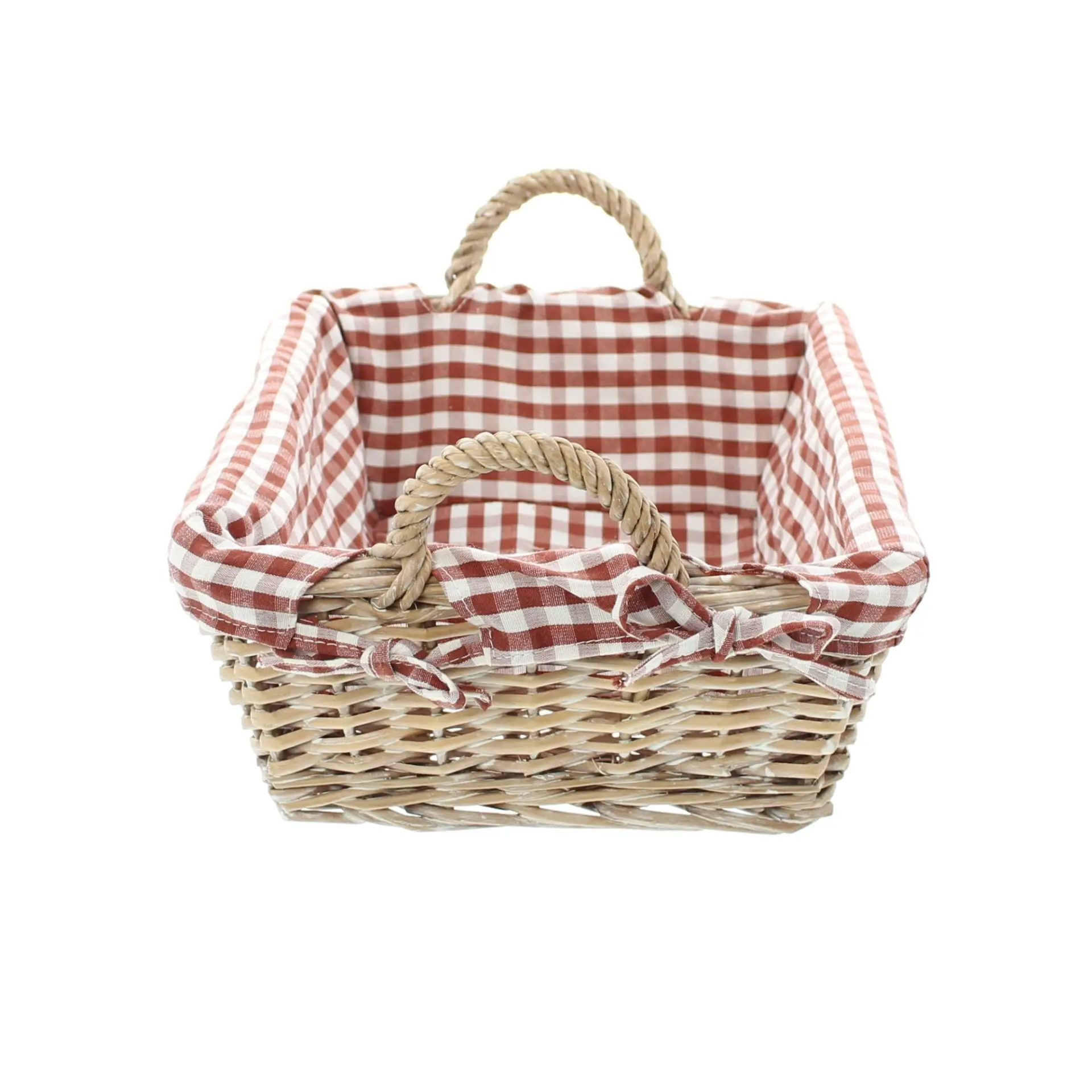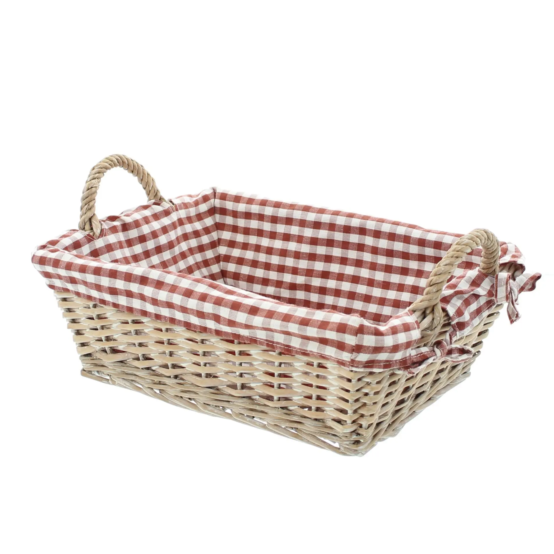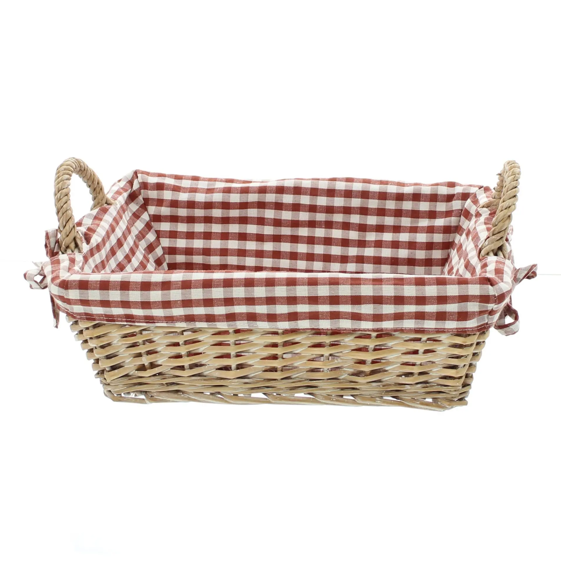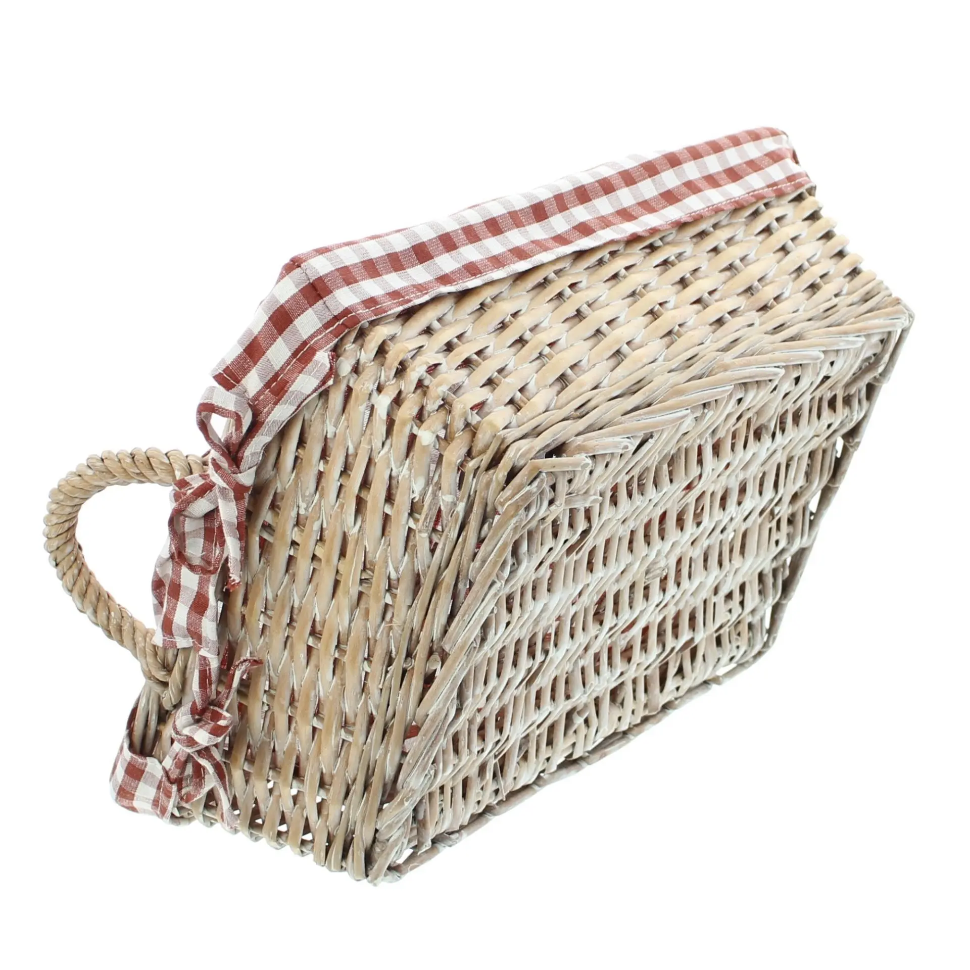 in trendig rustikalem Karodesign, weiß gekalkte und stabil geflochtene Spaltweide, seitliche Griffe, herausnehmbarer Stoffeinsatz in nostalgischem Rot/Weiß
