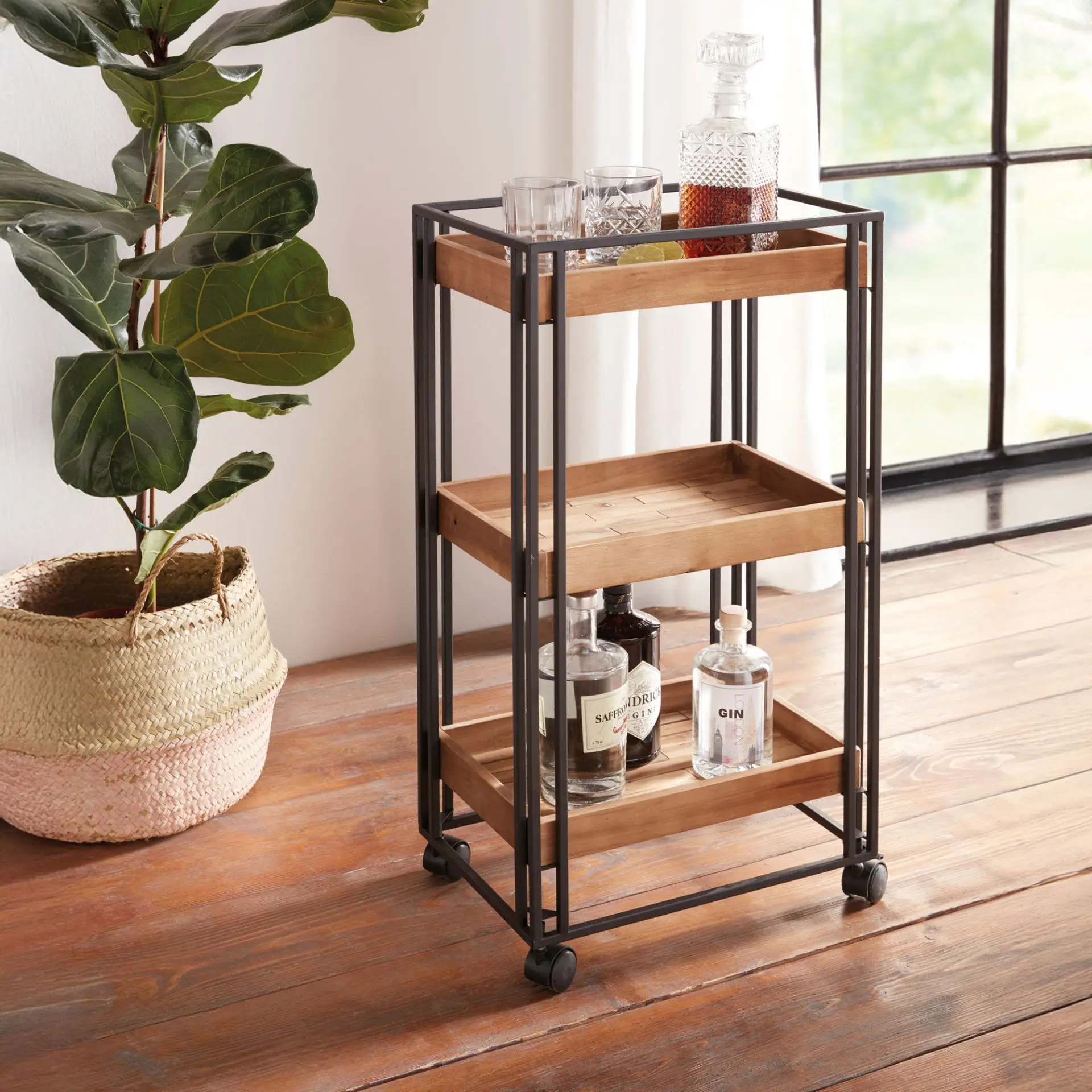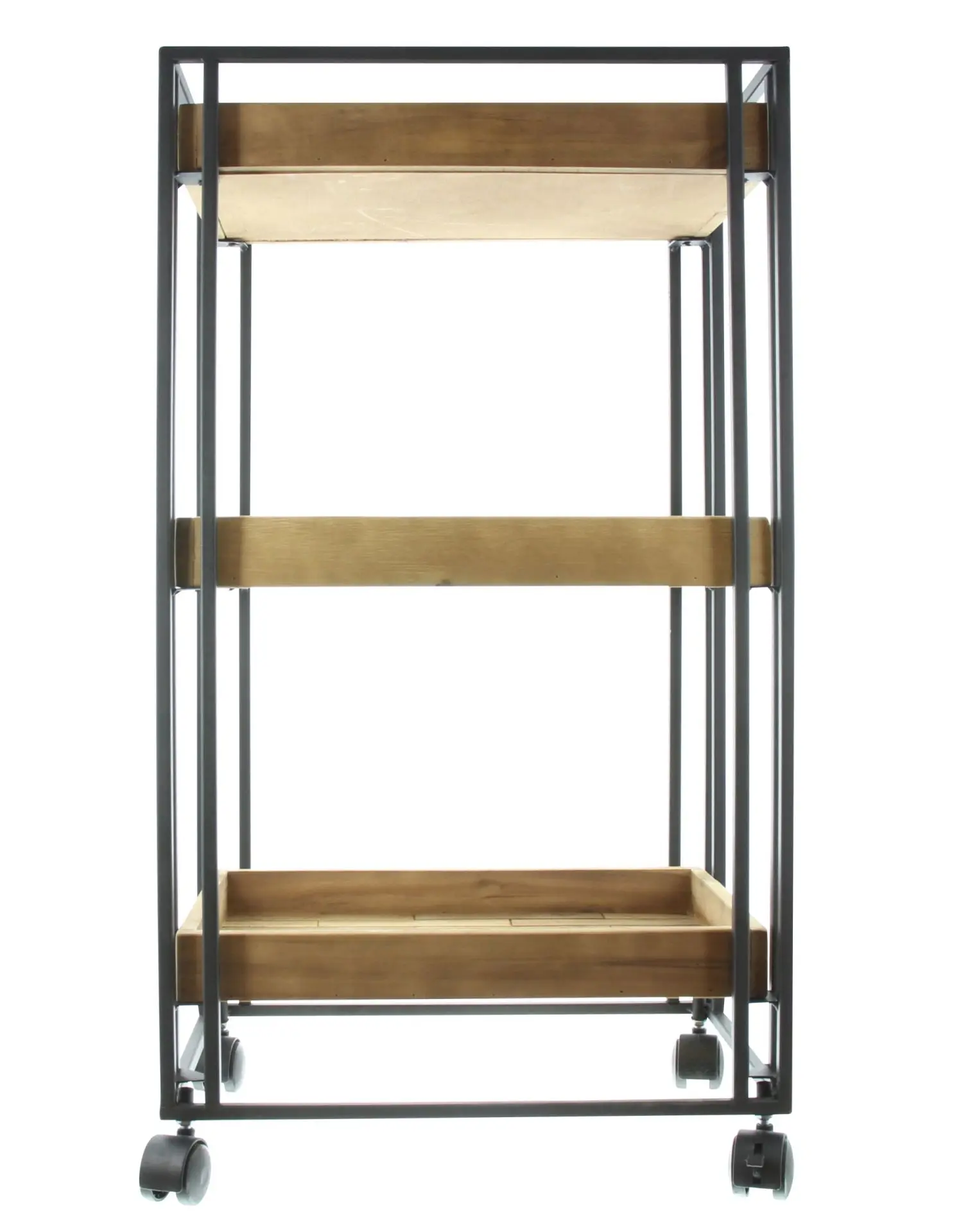 drei Böden aus Akazienholz in Tablettform, warmer Braunton, mattschwarz lackiertes Metallgestell, Kunststoffrollen
