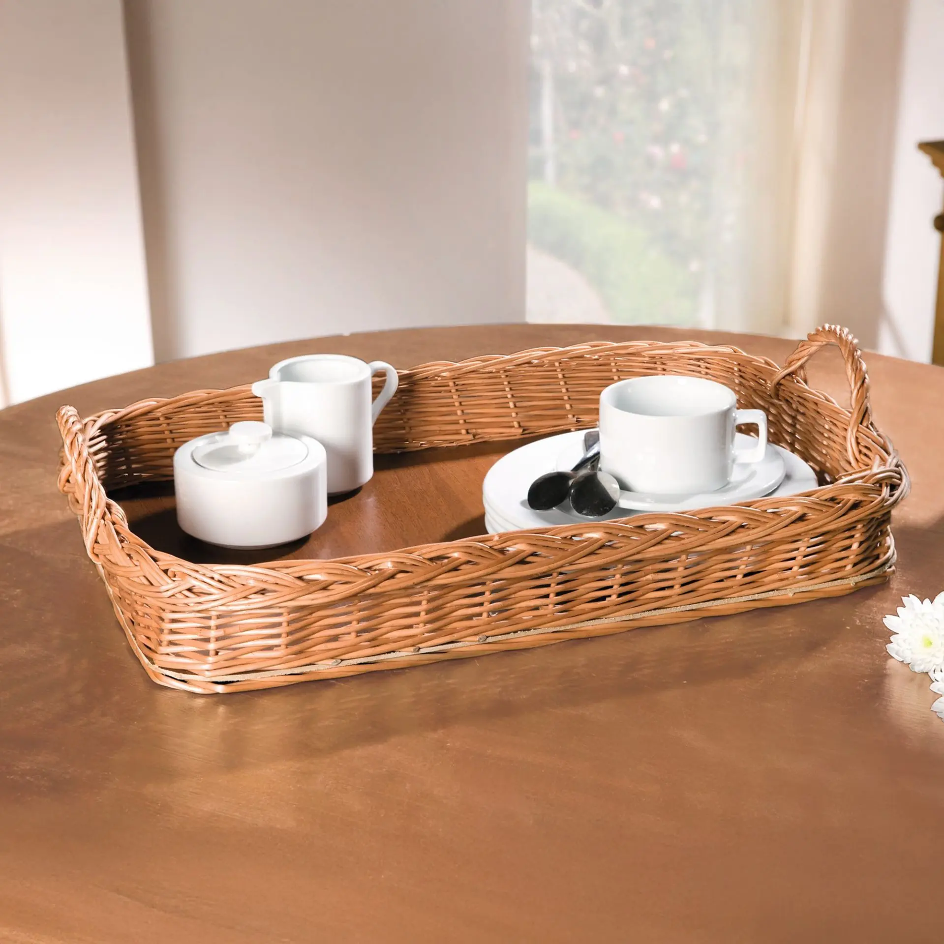 dekorativ geflochtener Zopfrand, seitliche Griffe, holzgemaserte Pressspanplatte, Vollweide in Naturton, handgeflochten in Europa