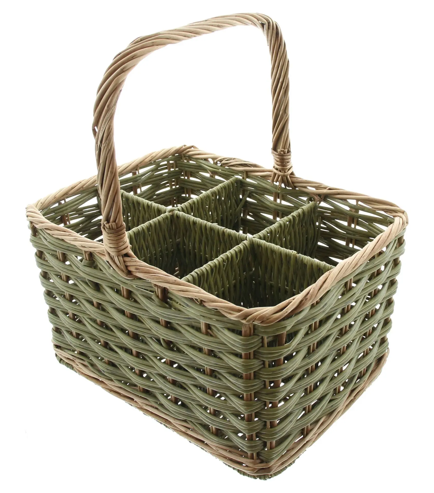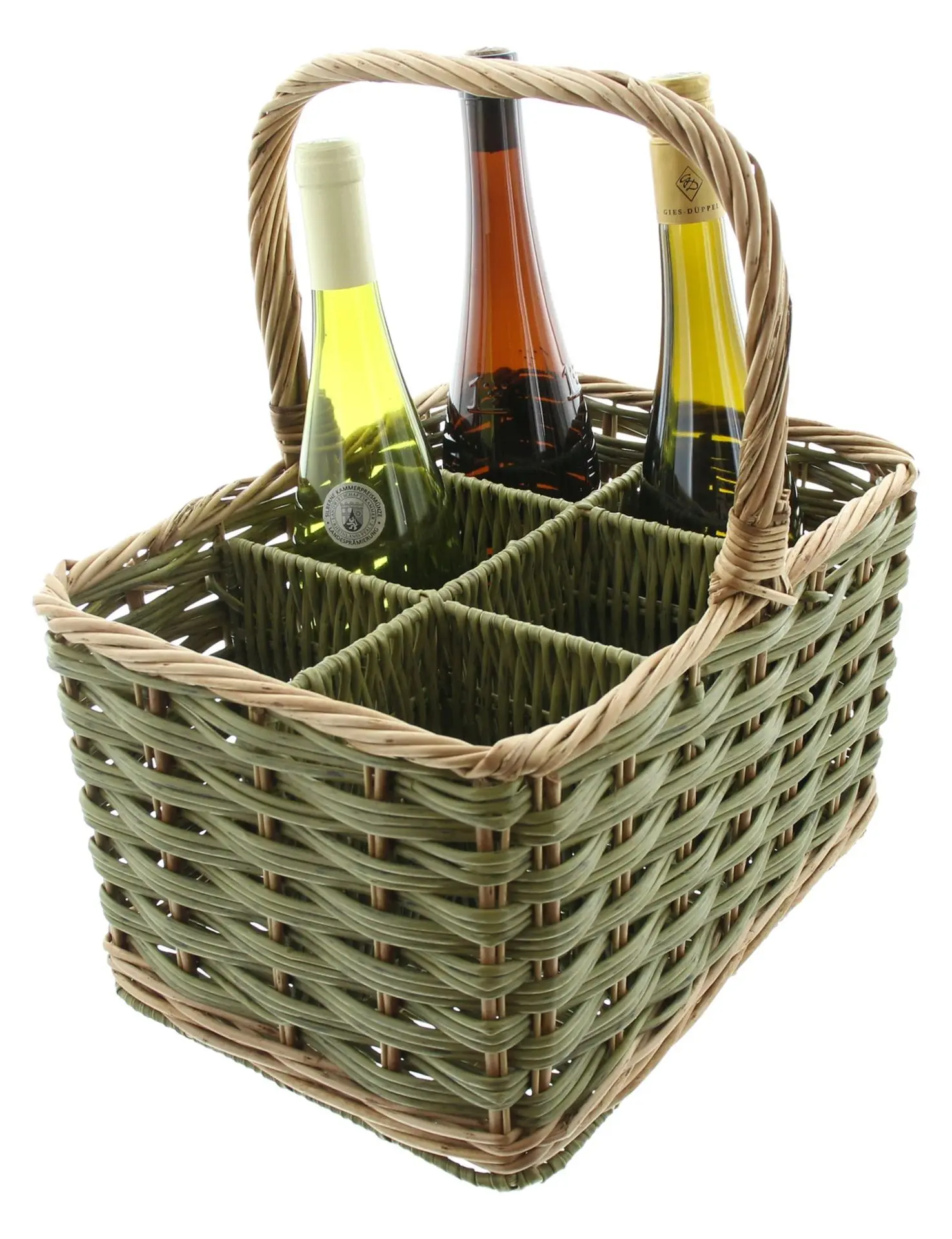 Polyrattan in trendigem Oliveton, Griff und Rand aus ungeschälter Naturweide, stabil auf Metallrahmen geflochten, Facheinteilung