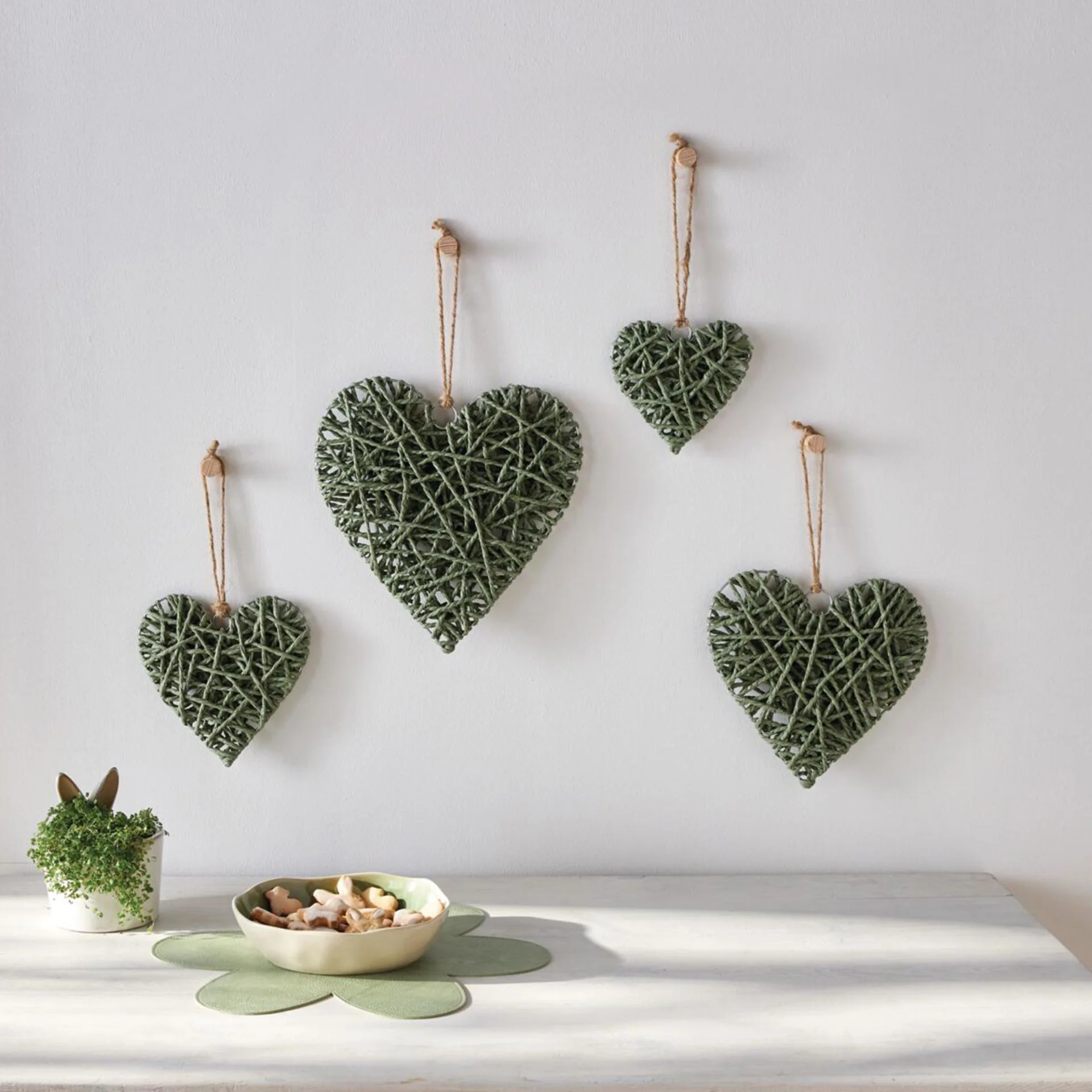 Setzen Sie stilvolle Akzente mit dem Herzhänger "Olivgrün", 4er Set. Die in der Trendfarbe Oliv gefärbte Papierschnur ist dekorativ auf einen stabilen Metallrahmen gewickelt und mit natürlicher Juteschnur veredelt. Unterschiedliche Größen bieten vielseitige Einsatzmöglichkeiten für Ihr Zuhause oder besondere Anlässe. Ein elegantes Dekorationselement, das zeitlose Natürlichkeit ausstrahlt.in der Trendfarbe Oliv gefärbte Papierschnur, dekorativ auf stabilen Metallrahmen gewickelt, Juteschnur