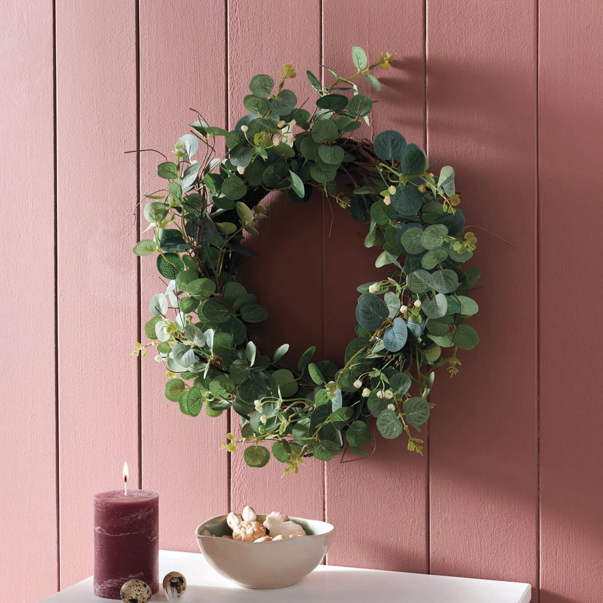 Ein Hauch natürlicher Eleganz für Ihr Zuhause: Der Kranz "Eukalyptus" verbindet stabil verflochtene Kiefernzweige mit üppig dekorierten Kunstblättern und -blumen in einem ansprechenden Grünton. Dieses zeitlose Dekorationsstück bringt Frische und Stil in jeden Raum – perfekt für saisonale Akzente oder ganzjährig als stilvolles Highlight.