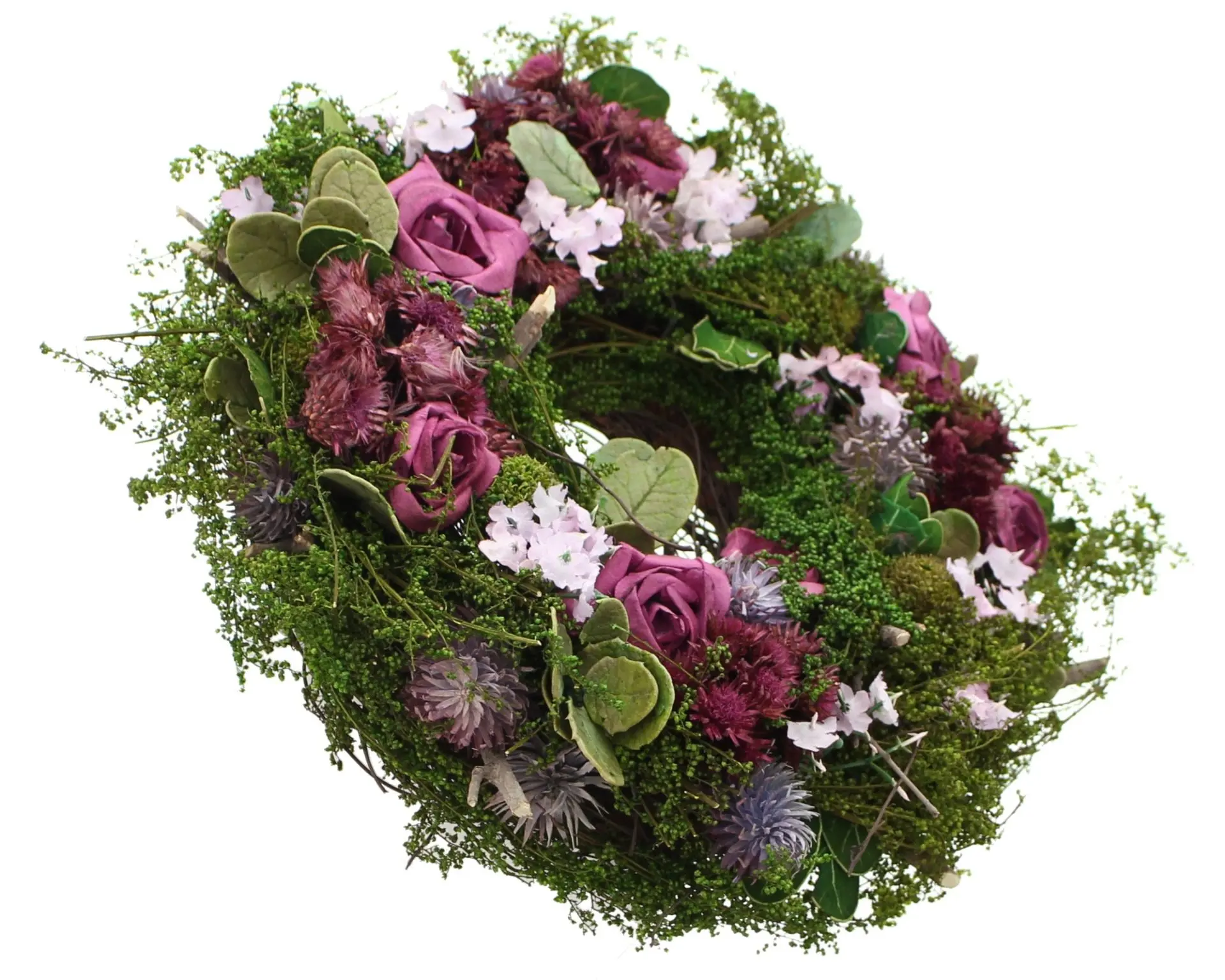 harmonisch abgestimmte Naturmaterialien und kleine Textilblüten in romantischen Grün- und Lilatönen