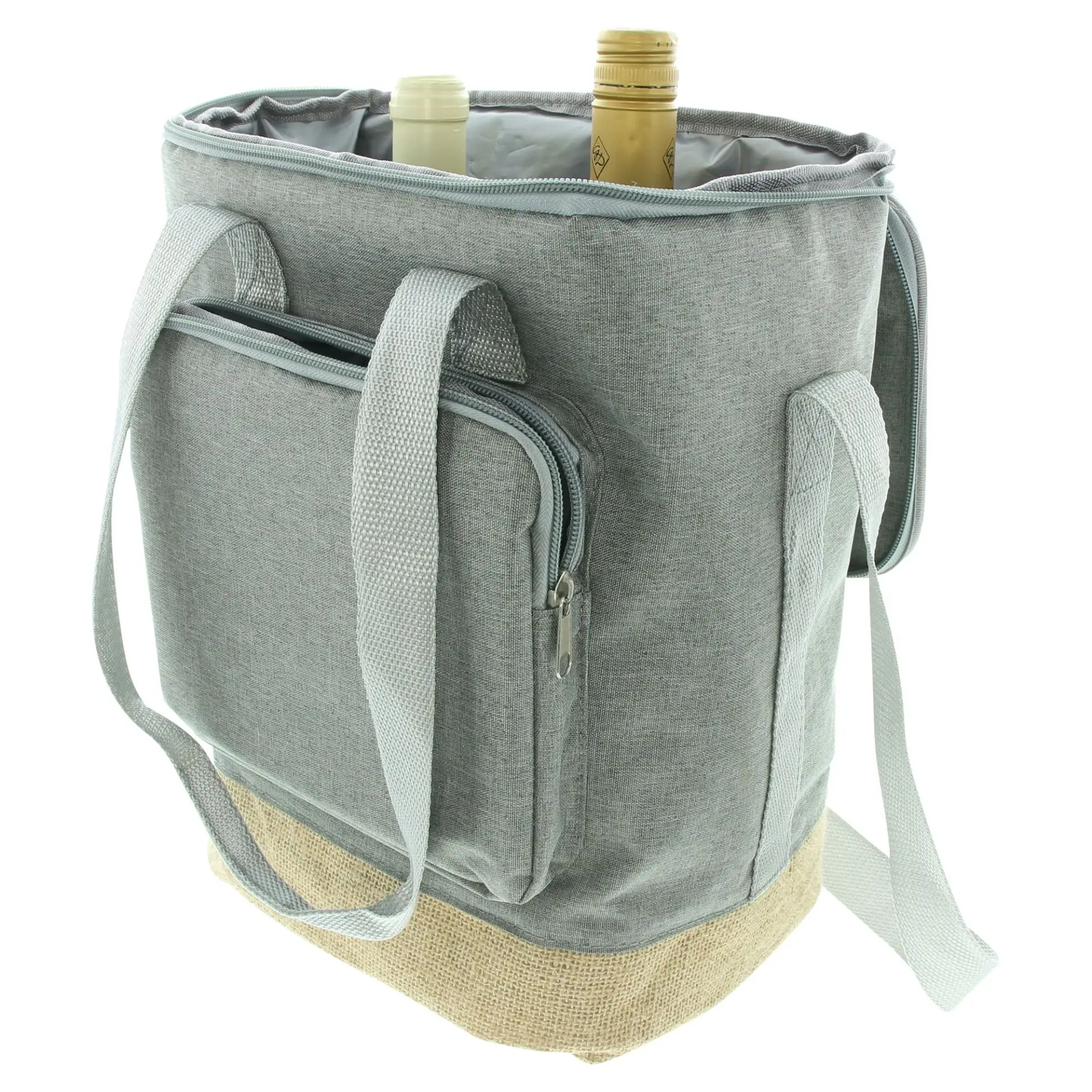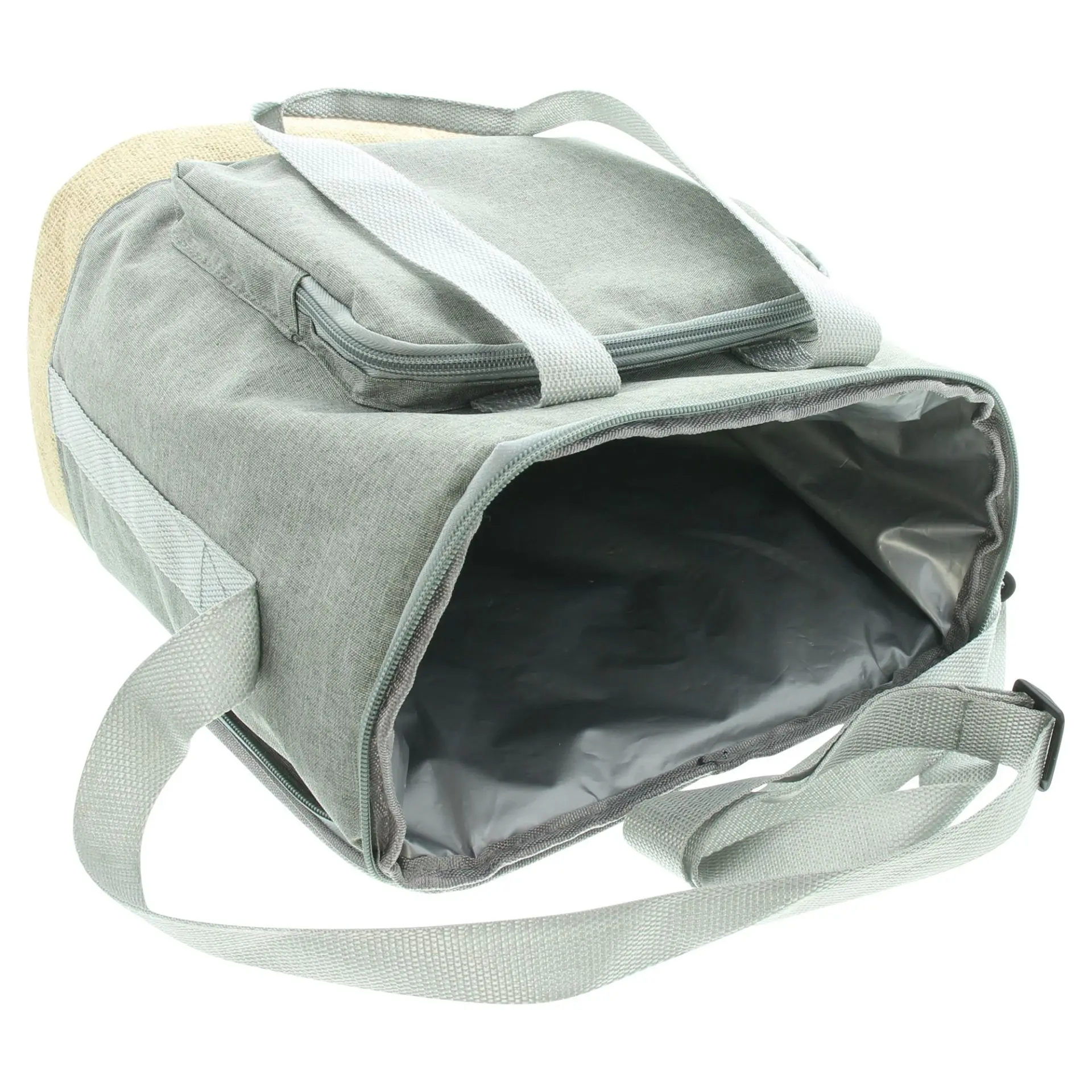 isolierende Alufolie innen, Leinenbezug in modernem Grau, abgesetzt mit naturfarbener Jute, leicht zu öffnen mit Reißverschluss, Henkel mit Klettverschluss, längenverstellbarer Trageriemen, Polyester