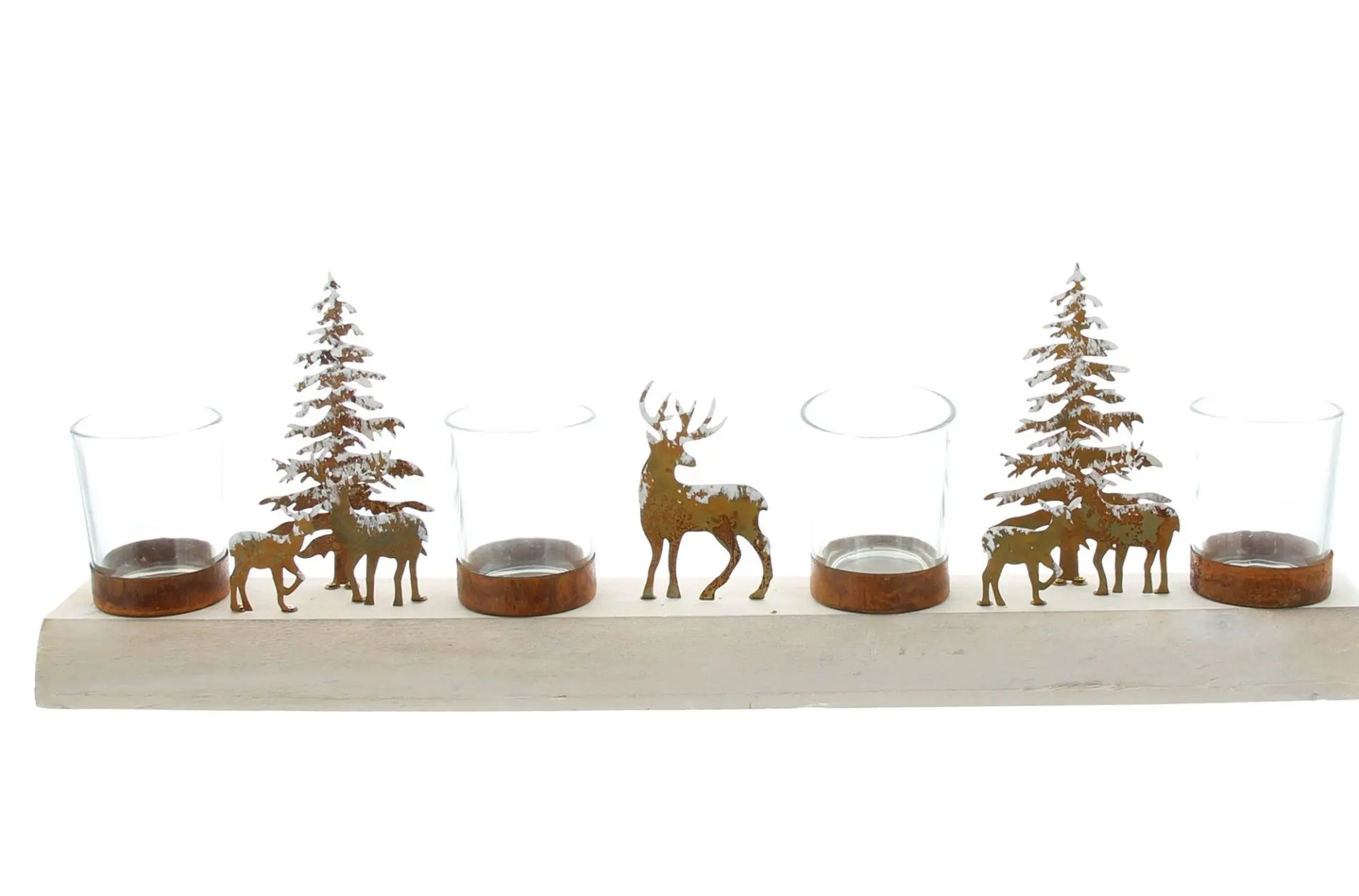 Metalldeko mit Edelrost, 4 abnehmbare Windlichter aus Glas, Holzsockel