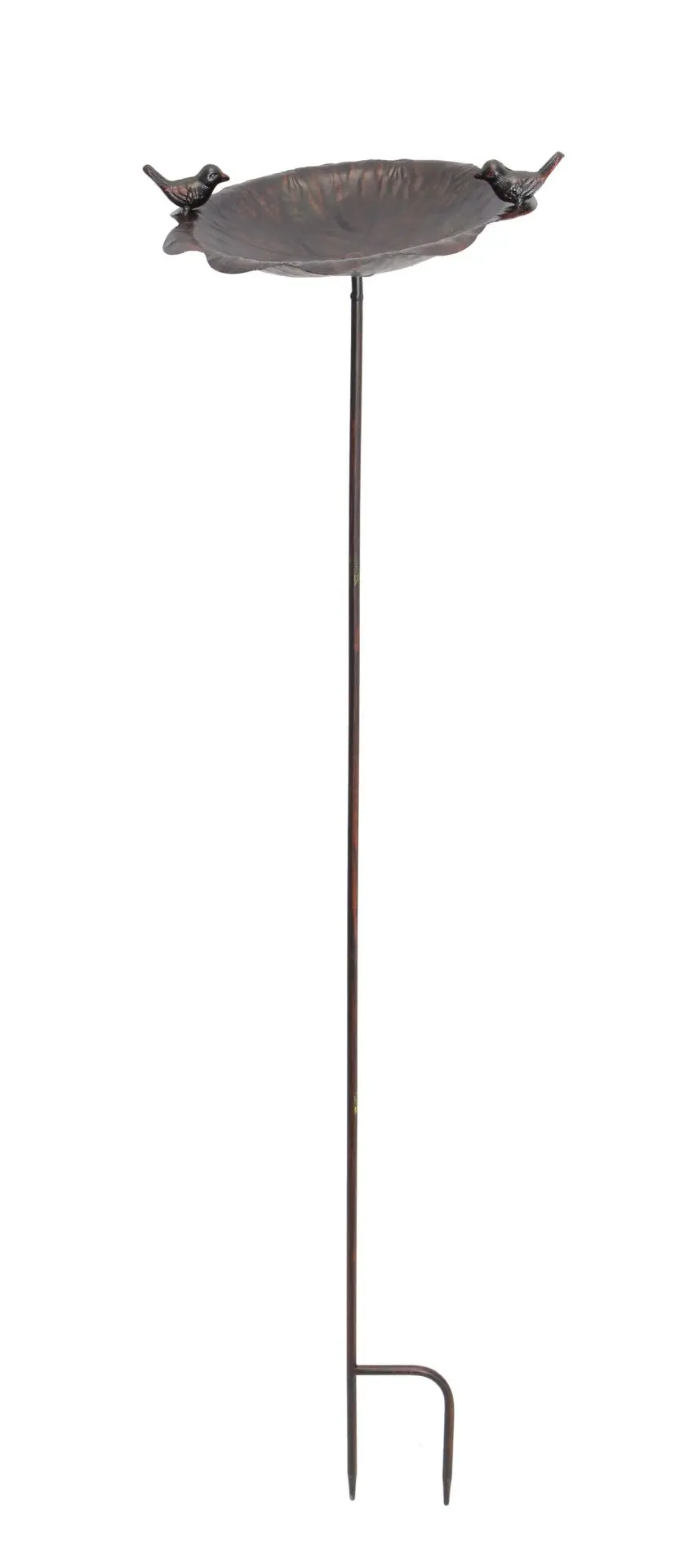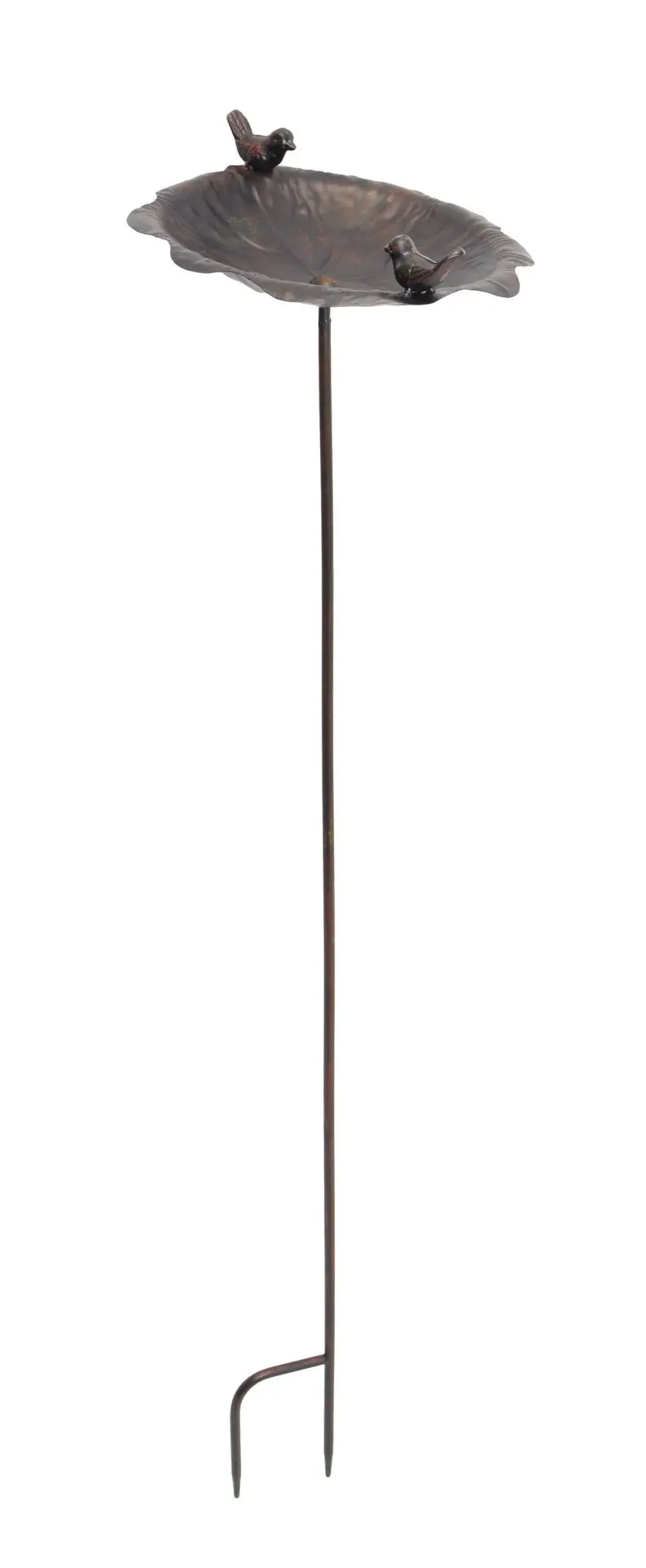Gartenstecker mit Schale in Blütenoptik, kleine Vögelchen zur Dekoration, Metall in dunklem Braunton mit trendigem Rostfinish